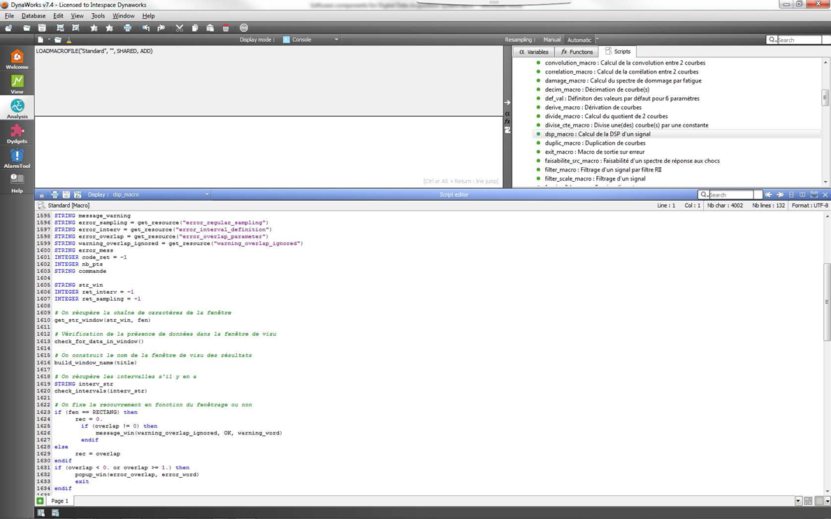 DynaWorks的分析工作臺提供了一種宏命令語言,允許用戶開發(fā)處理腳本和完整的應(yīng)用程序。所開發(fā)的應(yīng)用程序存儲在集中的“內(nèi)部”數(shù)據(jù)庫(數(shù)據(jù)庫服務(wù)器)上,名為“資源”數(shù)據(jù)庫。這允許每個用戶將它的腳本存儲為個人資源,也可以在DynaWorks的生態(tài)社區(qū)中共享它們,讓更多的用戶可以獲取豐富的程序資源。