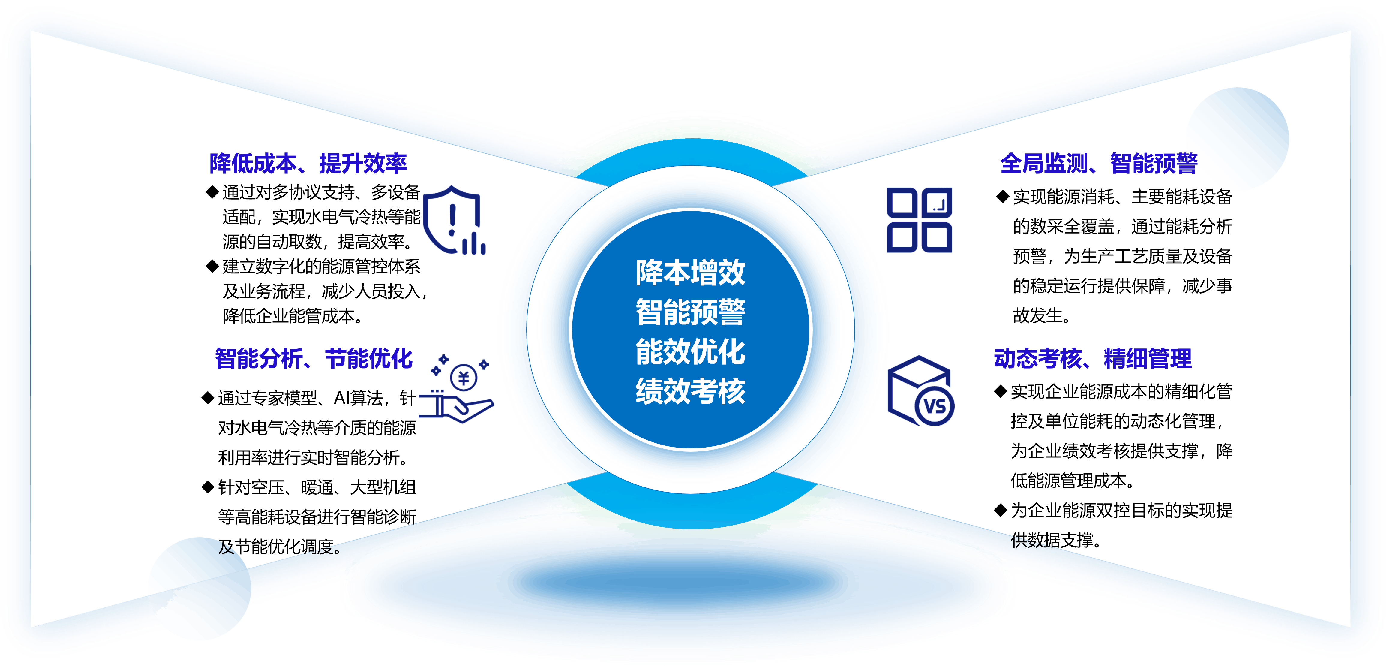 建立能源數(shù)據(jù)采集、能耗自動統(tǒng)計、能耗在線監(jiān)測、能源成本管理、能耗分析等業(yè)務(wù)核心功能,實現(xiàn)企業(yè)能耗全面管控與智能化分析。