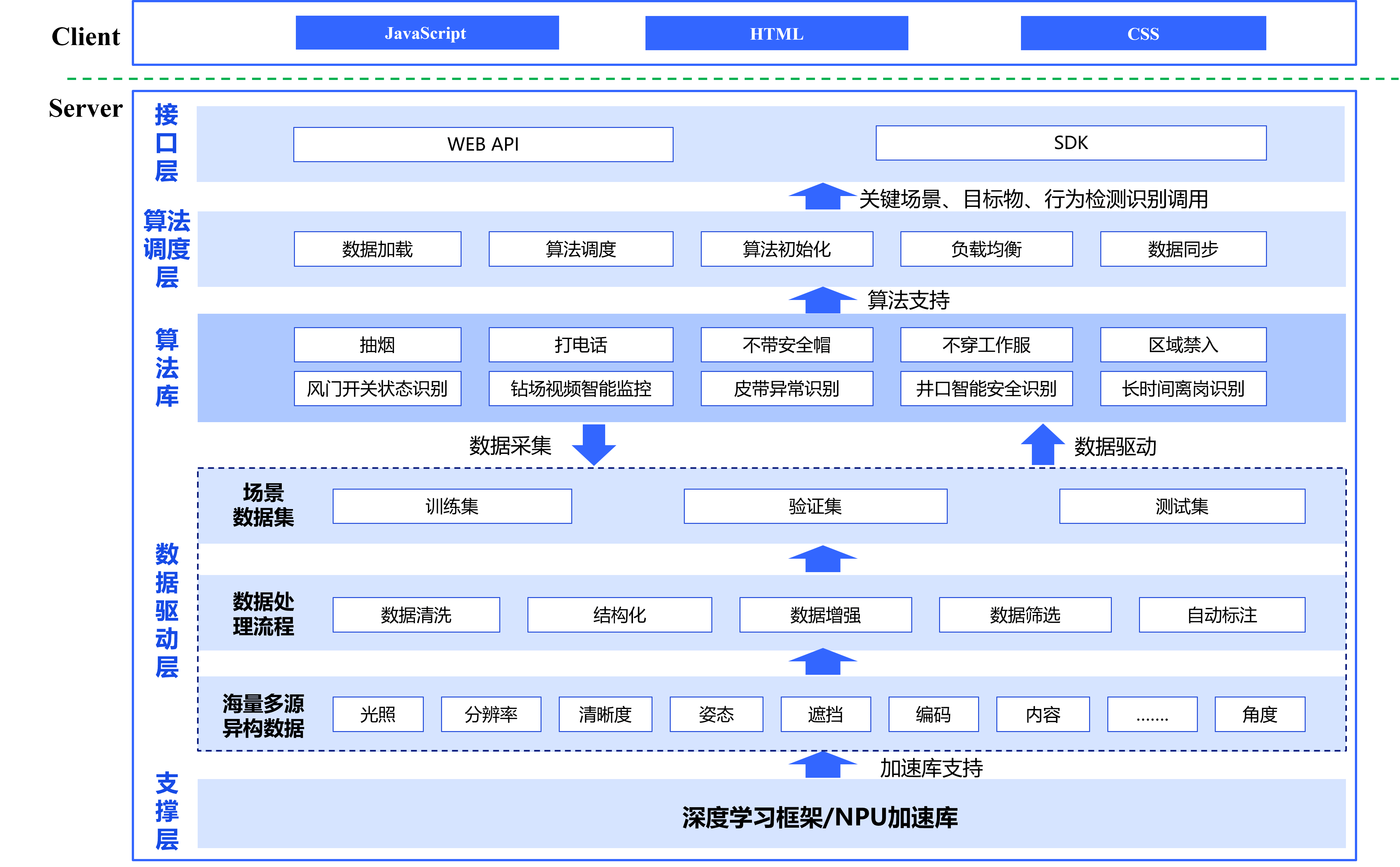 針對(duì)工業(yè)企業(yè)進(jìn)行人員違規(guī)行為、設(shè)備運(yùn)行異常、不安全場(chǎng)景監(jiān)測(cè)的需求,如人員抽煙、打電話、不帶安全帽、不穿工作服、區(qū)域禁入、長(zhǎng)時(shí)間離崗、風(fēng)門(mén)開(kāi)關(guān)狀態(tài)監(jiān)測(cè)、皮帶異常監(jiān)測(cè)、井口風(fēng)險(xiǎn)識(shí)別等場(chǎng)景,本方案擬采用流媒體處理技術(shù)、深度學(xué)習(xí)圖像處理技術(shù)、深度學(xué)習(xí)框架構(gòu)建、神經(jīng)網(wǎng)絡(luò)算法建模、參數(shù)優(yōu)化、模型量化、網(wǎng)絡(luò)編程等核心技術(shù)進(jìn)行AI視頻分析系統(tǒng)框架設(shè)計(jì),實(shí)現(xiàn)對(duì)前端視頻流的讀取解析,并采用神經(jīng)網(wǎng)絡(luò)算法模型完成對(duì)視頻圖像中關(guān)鍵場(chǎng)景、行為、目標(biāo)物的檢測(cè)識(shí)別,為業(yè)務(wù)管理提供數(shù)據(jù)反饋。并將檢測(cè)結(jié)果在軟件前端進(jìn)行可視化展示,為業(yè)務(wù)端提供一種可靠的檢測(cè)監(jiān)控手段。為企業(yè)的安全預(yù)防監(jiān)測(cè)及異常事件的管控提供強(qiáng)有力的技術(shù)手段,避免企業(yè)安全事故的發(fā)生及財(cái)產(chǎn)的損失。