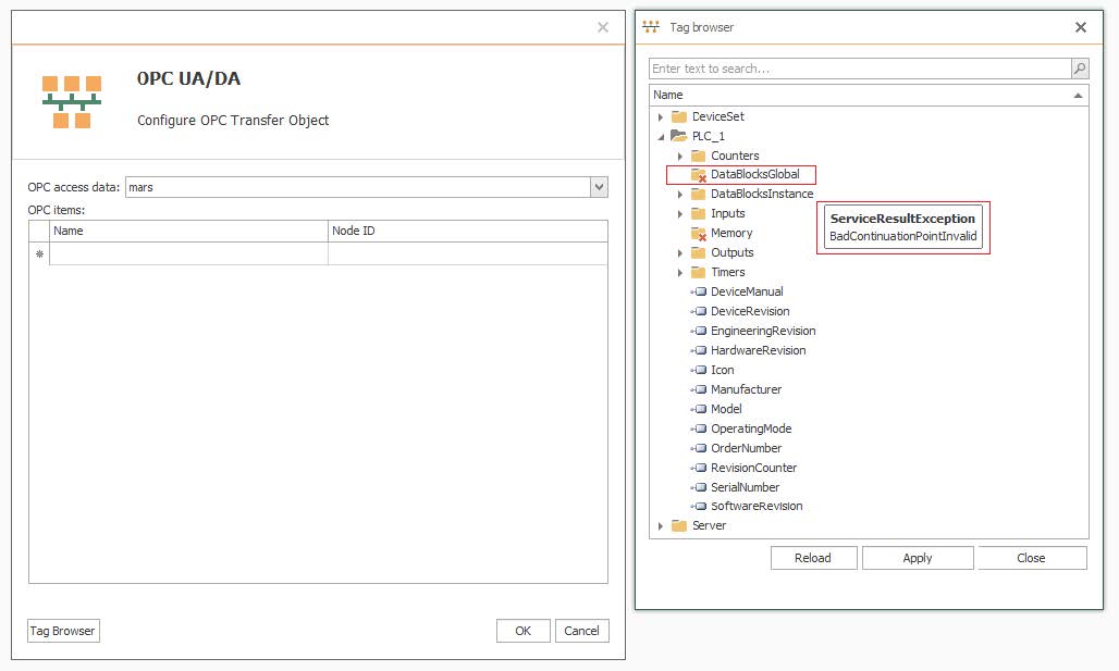 建立Connection階段,通過OPC UA/DA 的Tag Browser按鈕進行標簽瀏覽時,無法查看DataBlocksGlobal 組下的標簽,彈出錯誤信息: